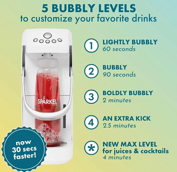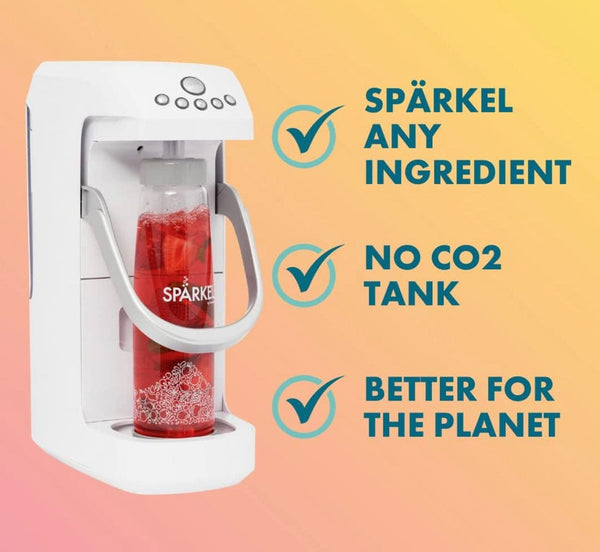 Experience the future of sparkling water with Spärkel - the revolutionary beverage system that eliminates the need for a CO2 Cylinder. Our new and improved models are now 33% faster, offering a new "Max" Carbonation Level, and feature enhanced bottle seals that prevent any unwanted mishaps.