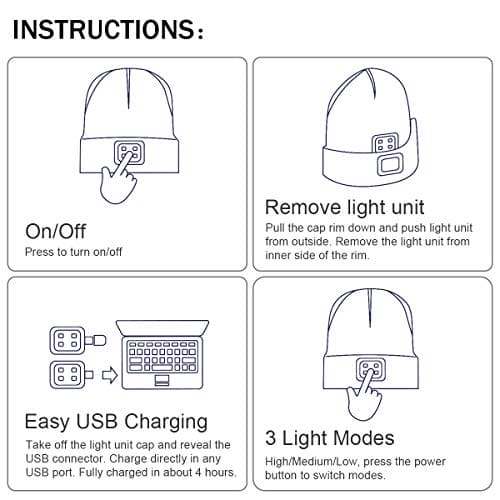 Details: Specification: Light Source: 4 LEDs Light Brightness: Low, Medium and High Charge Time: 1.5 hours Size: One size fits most people (30x20cm) Power Supply: 250mAh Rechargeable Battery Material: Acrylic Weight: 100 grams Best Christmas Gift Comfortable, warm, and washable, our Unisex Lighted Beanie Cap provides incredible hands-free lighting so you can get on with things in cold days. A perfect Gift for anyone in the family. Ideal for joggers, bikers, hikers... This is the safe flashlight when you running or cycling at night.It is a safe hat for running,cycling,walking,fishing or hunting, ski, camping, hiking, hunting, jogging, construction or just for fun, great for being active at night. Washing Instruction 1.Pull out one side of the led light. 2.Then back into the hole Vertically. 3.Take the full Circuit out