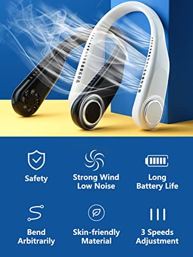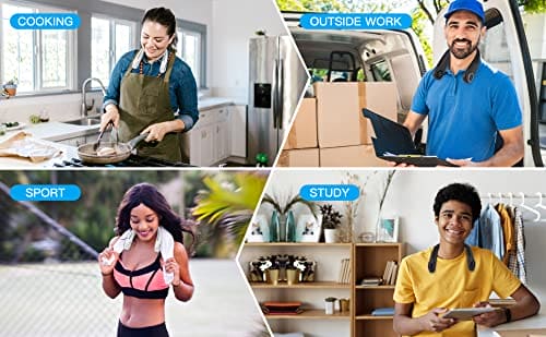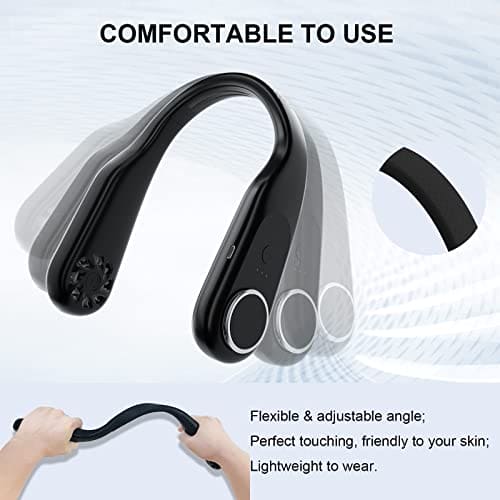 - 【Hands-Free Design】This upgraded portable neck fan is designed to be worn around the neck so your hands can be free. It's a perfect idea for outdoor event, such as watching soccer and baseball, camping, climbing, fishing, jogging, makeup, cooking, etc. You can hang the fan around your neck and take it everywhere, will not feel tired or uncomfortable.