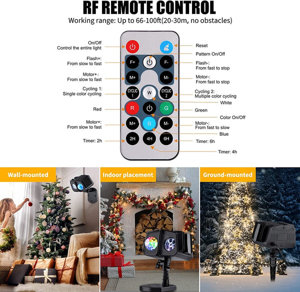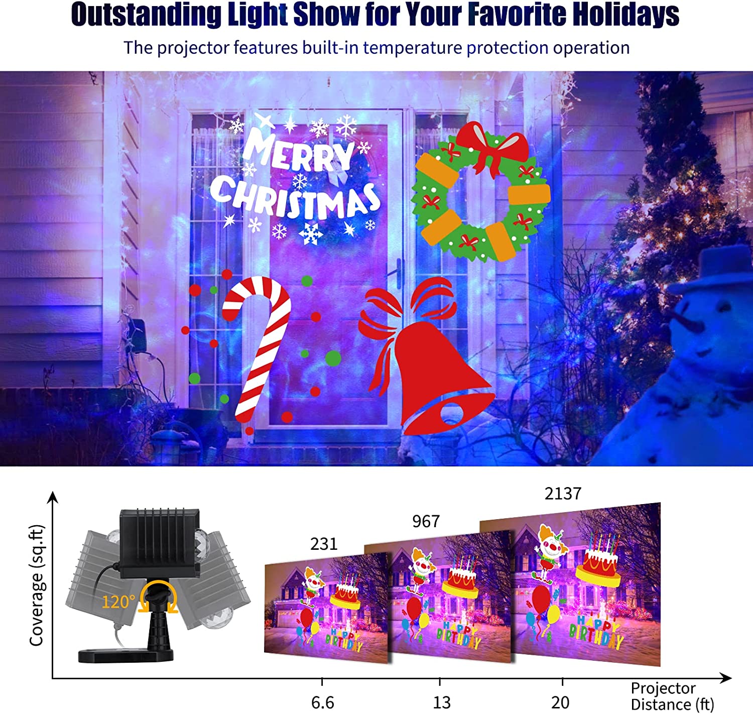 About this item Unique Design: 2 motor drivers with 10 colors switchable and 16 patterns changeable, weather resistant, -31F°- 100F°operating temperature with 1 built-in ventilation fan, 13.1 Ft optimal projecting range and 2137 sq.Ft. max projecting coverage, adjustable safe degree...View more