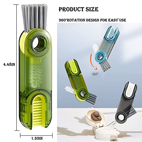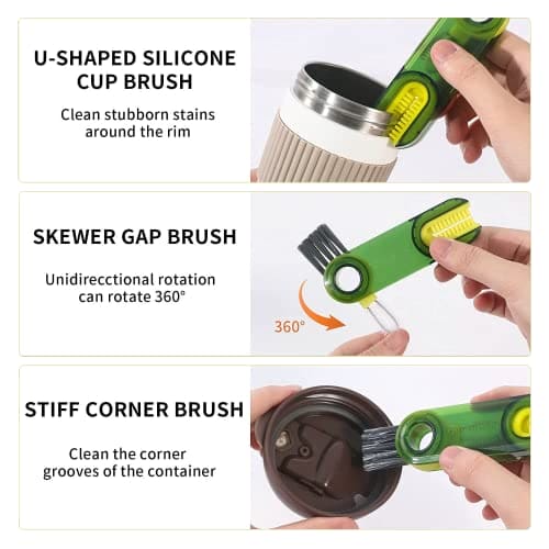 Brand: ARAINYColor: GreenFeatures: 【3 in 1 MUILTIFUNCTIONAL CLEANING BRUSH】- The multifunctional tiny bottle cleaning brush is desgned into 3 prts: ①U-shaped brush which can match the cup lip to clean stubborn stains around the cup mouth. ②Tiny Gap Brush to...View more