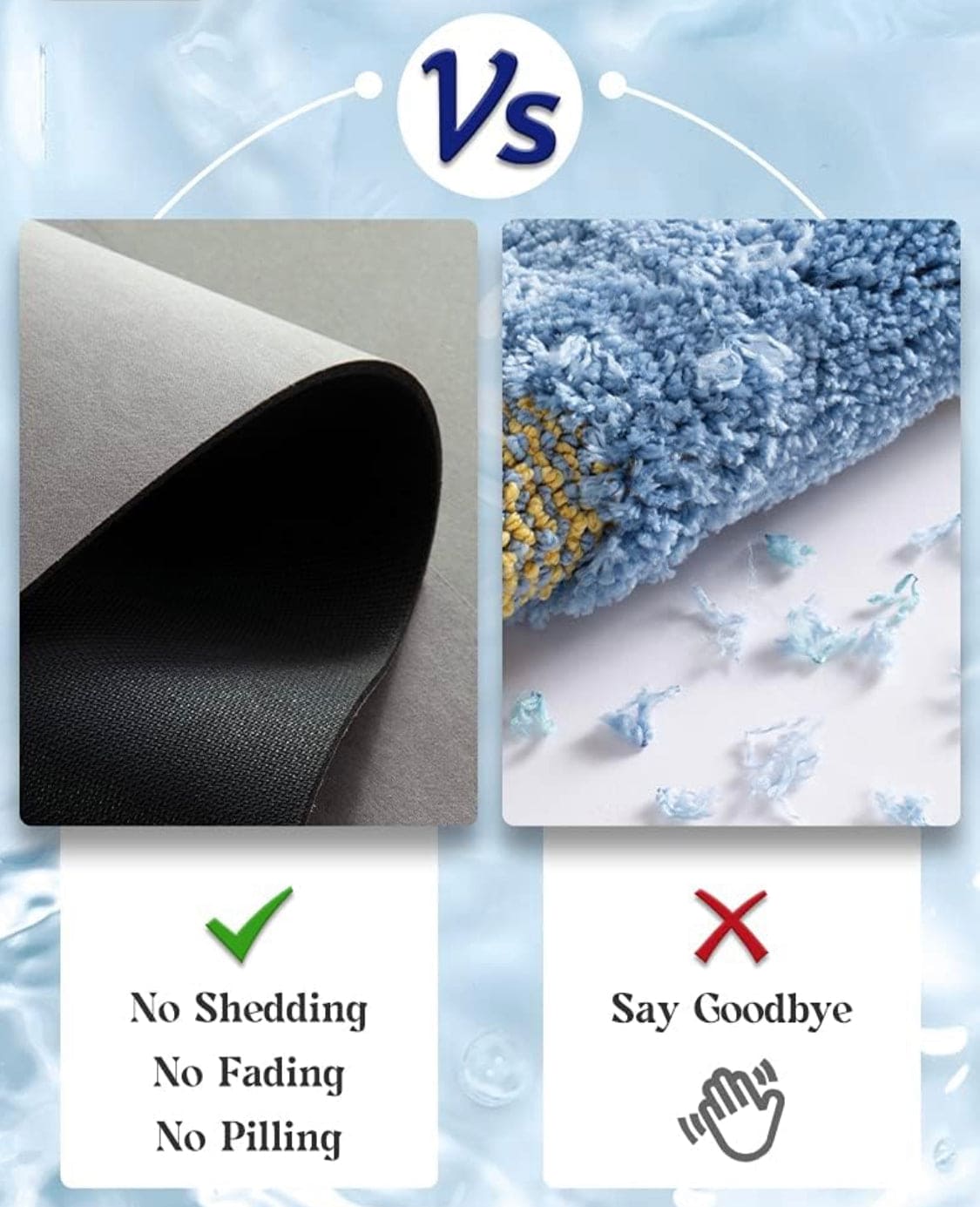 【Resistant to Dirt & Long-lasting】Crafted with a Faux suede surface, these innovative bathroom mats eliminate concerns of fiber shedding or fuzzy pilling commonly seen in traditional chenille mats. This rubber bath rug boasts exceptional durability, free from issues like shedding, fading, wearing, or harboring dirt and hair.