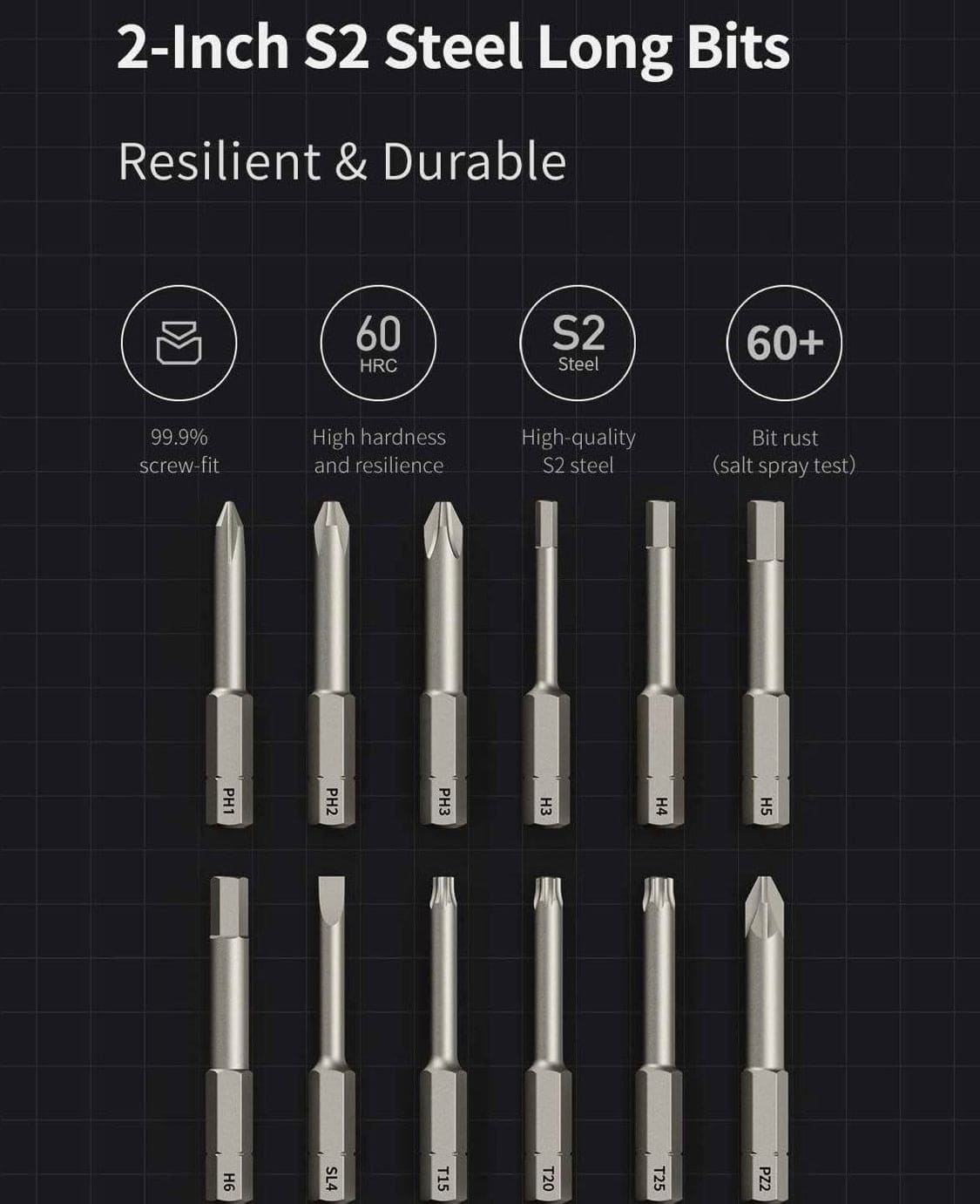 - 1 X Set of 12 Bits (C6.3 x 50 mm), including Philips(PH1/PH2/PH3), Hex(H3/H4/H5/H6), Torx (T15/T20/T25), Flat blade(SL4), Pozidriv(PZ2)